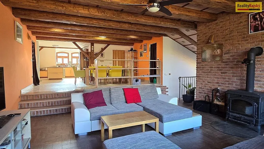 Dalším objektem je podkrovní bytová jednotka vystavěná na původní stodole. Byt má dispozici 8+kk, dominantní je zejména hlavní obytná místnost s krásným výhledem do zeleně, opticky propojená s jídelní částí a kuchyní. Pokoje situované po obvodu mají zkosený strop. Dále jsou zde dvě koupelny společné s wc a komora. I zde je hojně využito dřevo, které v celém prostoru působí příjemně a útulně. Dostatek světla zajišťují i stropní světelné tunely. V bytě je podlahové vytápění. V přízemí prostorná stodola využívaná k parkování a skladování a dále venkovní a vnitřní skladové prostory. Stavba je částečně nedokončena. Přibližná užitková plocha bytu je 190 m2. Vytápění bytu elektrickým kotlem spolu s krbovými kamny s výměníkem.