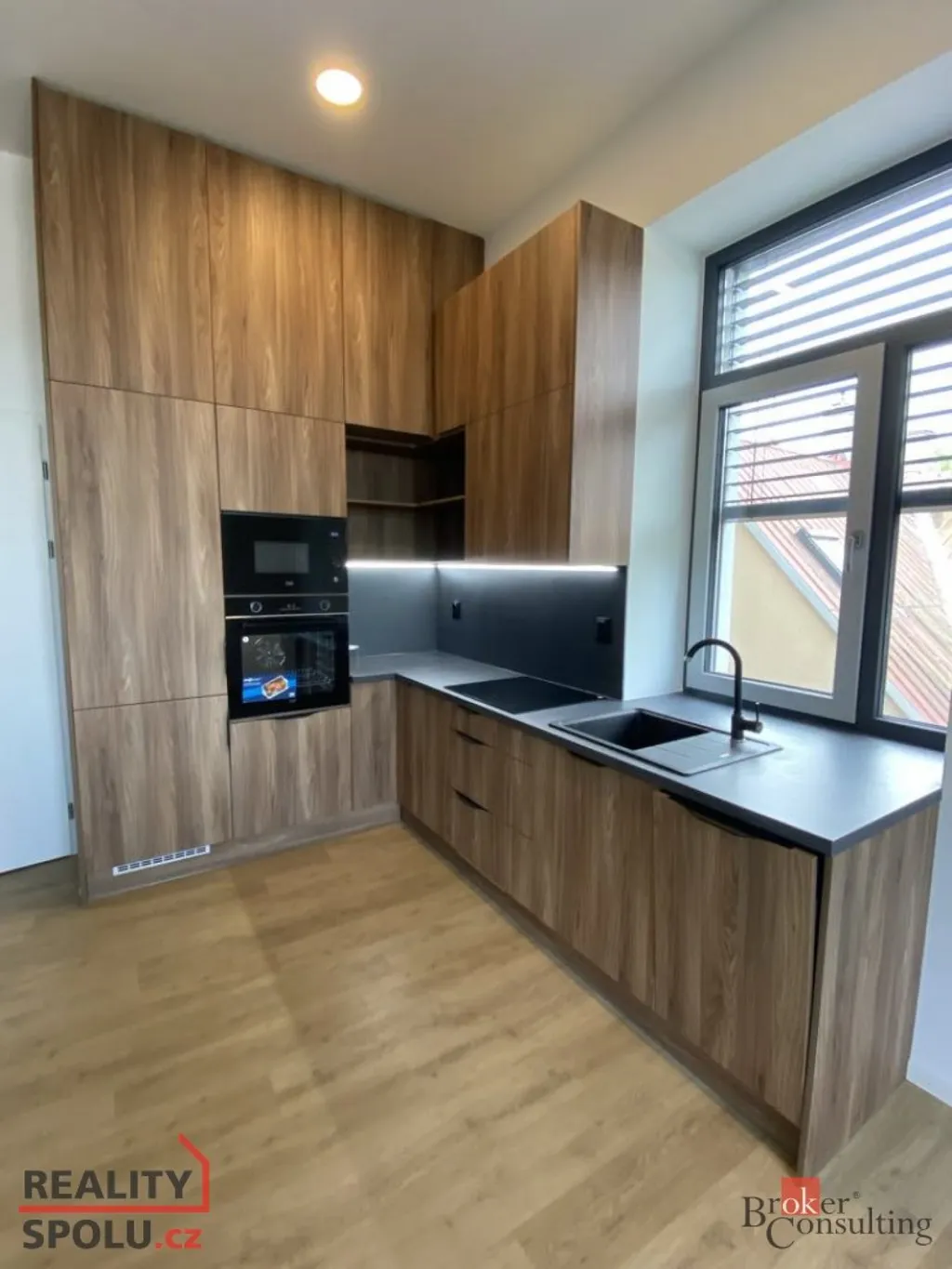 Interiér je zařízen s důrazem na komfort a praktičnost. Nechybí moderní kuchyňská linka s vestavěnými spotřebiči, pračka se sušičkou ani vestavěné skříně. Příjemnou atmosféru dotváří podlahové vytápění, kvalitní vinylové podlahy a elektrické rolety pro maximální pohodlí a soukromí.