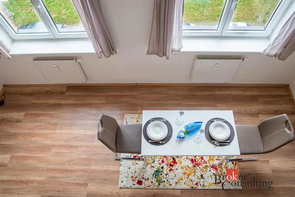 Byt je řešen jako mezonetový a nabízí praktické propojení otevřeného obytného prostoru s kuchyňským koutem, samostatného pokoje, prostorné šatny a patra, které dnes slouží jako ložnice nebo relaxační zóna. Díky tomuto řešení působí byt vzdušně a nabízí více soukromí než klasická dispozice 2+kk.