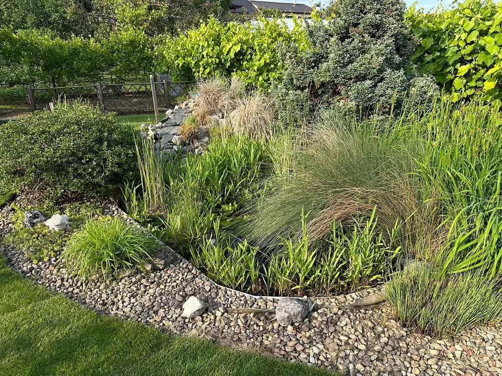 Za domem je zcela uzavřený dvůr s novou WPC terasou s udírnou, dvůr je okrasně upraven. Za dvorem je krásná okrasná zahrada s posezením, druhou (menší) zděnou udírnou, okrasným jezírkem se skalkovou kaskádou a po obvodu s ovocnými stromy a vinnou révou.