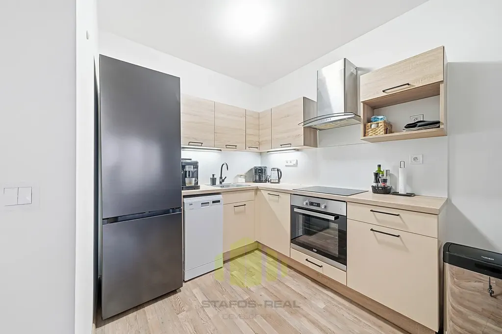 Byt je situován v prvním nadzemním podlaží sedmipodlažní moderní novostavby a je orientován na západ, což zajišťuje dostatek denního světla i příjemnou atmosféru během celého dne. Dominantou bytu je obývací pokoj s kuchyňským koutem řešeným na míru, ze kterého je přes francouzské okno přímý vstup na prostornou lodžii, která nabízí nadstandardní venkovní prostor pro posezení či relaxaci. Součástí bytu je dále samostatná ložnice, koupelna s vanou, umyvadlem, přípravou na pračku a otopným žebříkem, samostatné WC, předsíň a prostorná komora, která je v současnosti využívána jako šatna.
