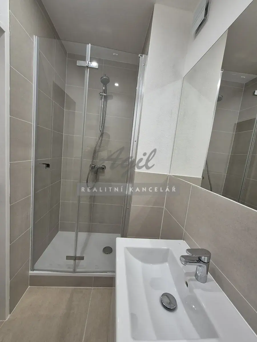 Koupelna s WC – umyvadlo se spodní skříňkou, nástěnné zrcadlo, sprchový kout, WC.