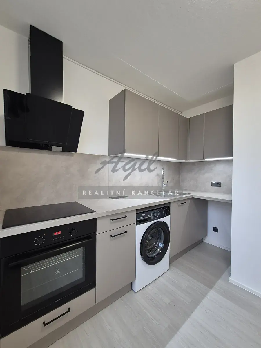 Kuchyň - kuchyňská linka, elektrická indukční deska, vestavná elektrická trouba, digestoř, přípojka na myčku, přípojka na pračku, pračka.