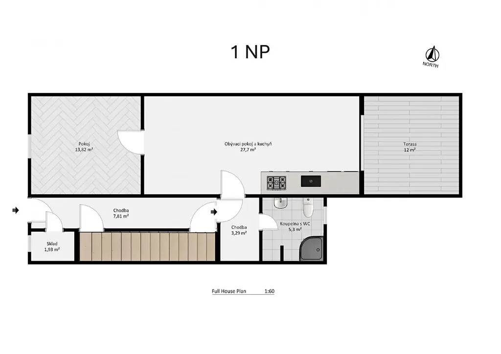 1.patro: byt 2+1 cca 47 m + lodžie + terasa 12 m