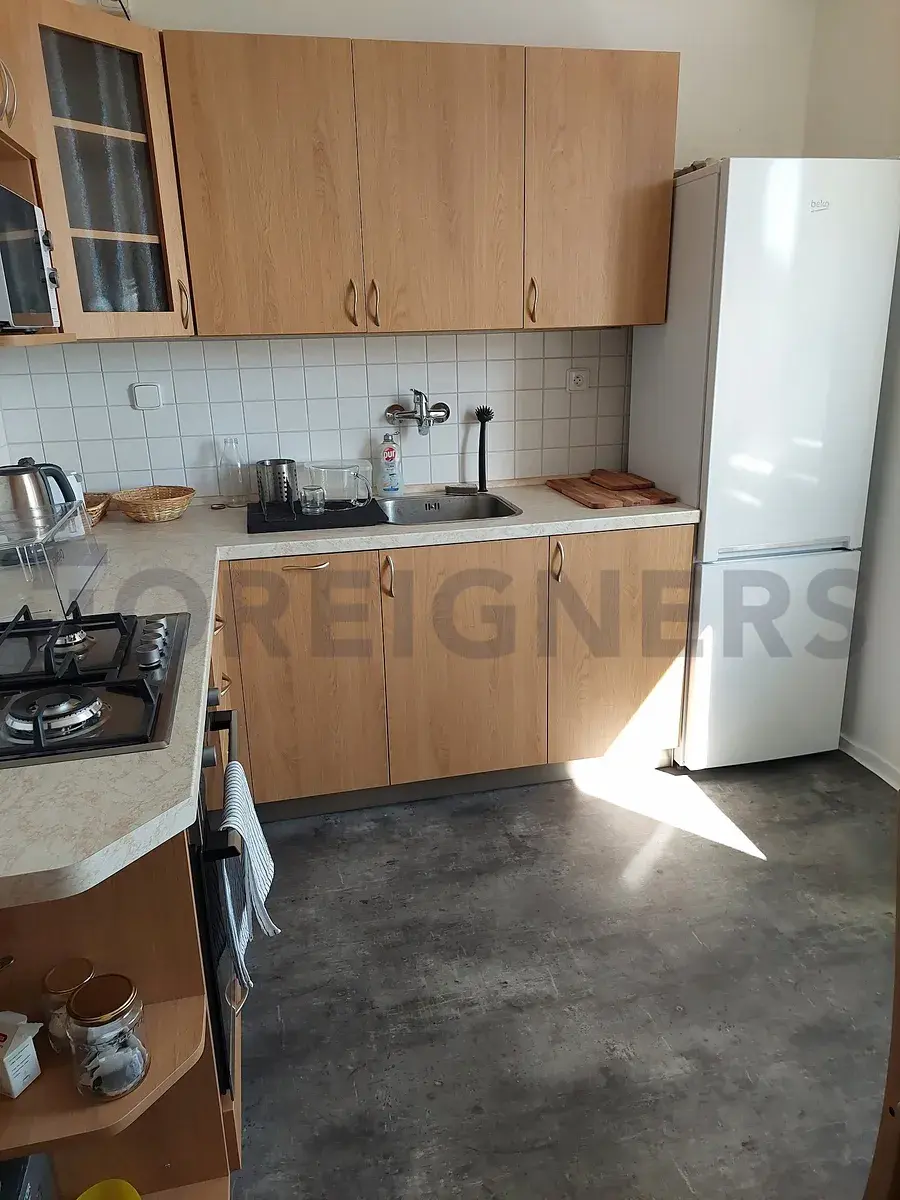 Byt sestává ze vstupní chodby s vestavěnou skříní. Koupelna s vanou, umyvadlem a zrcadlem. Samostatné WC s pračkou, umyvadlem a zrcadlem. Kuchyň s kuchyňskou linkou s plynovým sporákem, elektrickou troubou, lednicí s mrazákem, digestoří, rychlovarnou konvicí, toustovačem, dřezem a jídelním stolem se 4 židlemi.
