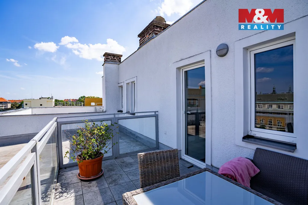 Byt nabízí prostornou terasu 10 m² s nádherným výhledem na historické centrum města, ideální pro relaxaci po náročném dni.