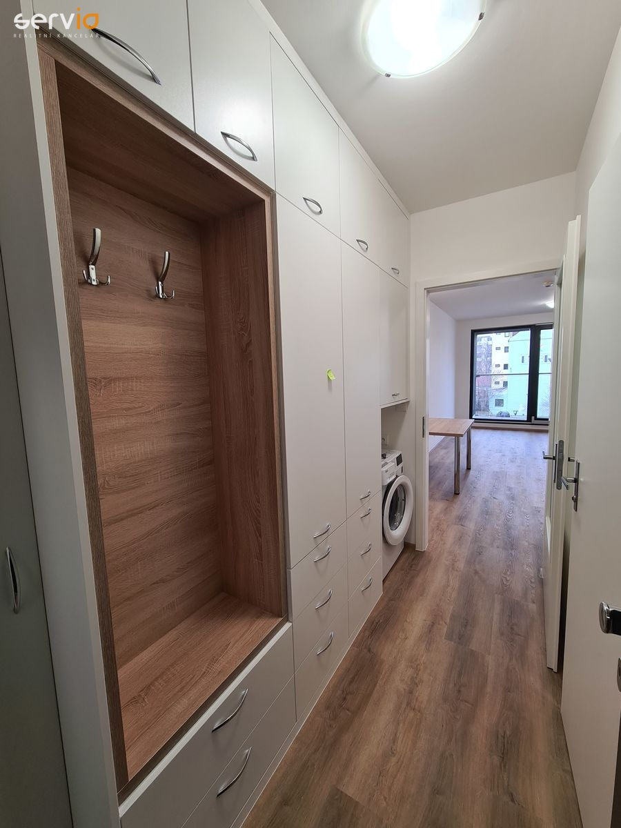 Součástí jednotky je moderně vybavená koupelna (sprcha nebo vana, WC, umyvadlo, galerka se zrcadlem, věšáky, pračka), kompletní KL včetně spotřebičů (myčka, trouba, sporák), vinylová podlaha, jídelní stůl a židle, možnost dovybavení postelí (jednolůžko, dvojlůžko), předsíňový nábytkový program, a další vybavení dle domluvy s majitelem. Ke každému bytu náleží sklep. Objekt zabezpečen kamerovým systémem. Možnost pronájmu krytého PS za poplatek 2.900,-Kč/měs. včetně DPH. Volné od 1.4.2026.