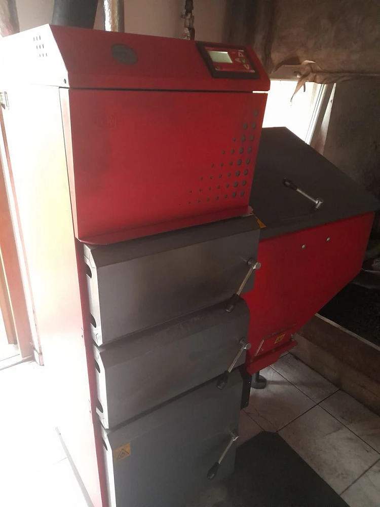 - kotel na tuhá paliva (automat, který 1x týdně doplňuje do kotle uhlí) ohřívá i vodu.