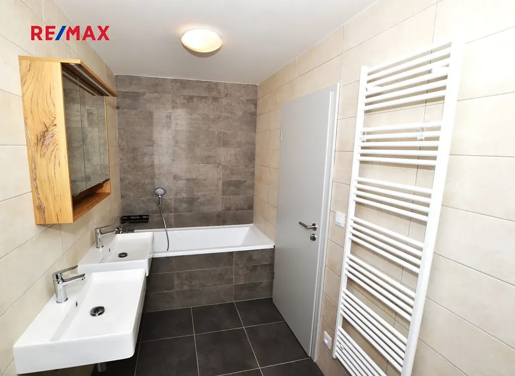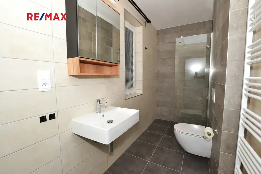 V patře jsou další tři pokoje, vzájemně neprůchozí, každý se vstupem z chodby, dále pak koupelna s vanou, toaletou a dvěma umyvadly. Za koupelnou se nachází místnost s řídící jednotkou a zásobníkem vody tepelného čerpadla pro vytápění a ohřev vody, zde je i možno instalovat pračku se sušičkou prádla.