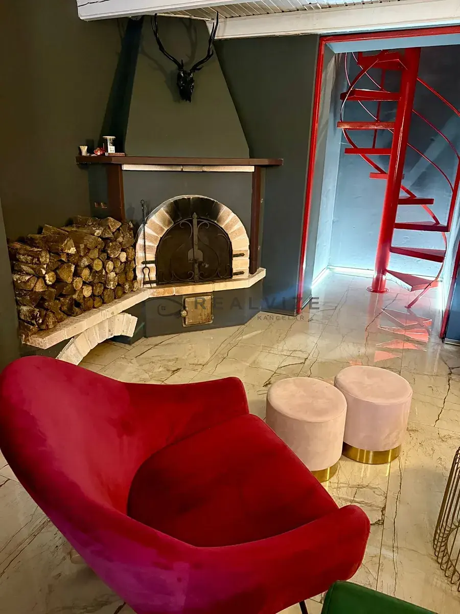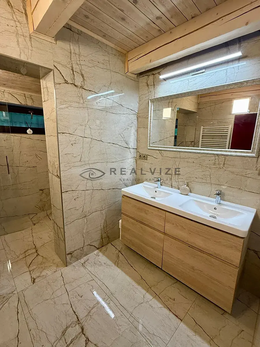 Dispozice chaty je 4+1 - předsíň, jídelna, kuchyně (kuchyňská linka se spotřebiči), z kuchyně je vstup na terasu, koupelna (sprchový kout, wc, bidet, dvě umyvadla). V 1. patře jsou dva pokoje a vstup na půdu. Z jídelny vede po schodech vstup do suterénu, kde se nachází obývací pokoj s krbem, odkud vede vstup na druhou terasu. V suterénu je také technická místnost.