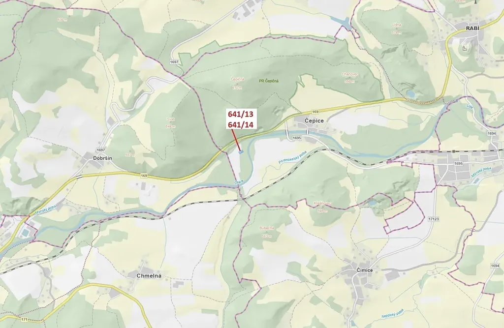 Lesní pozemky o výměře 1 958 m2, parcelní čísla 641/13, 641/14, podíl 1/1, katastrální území Čepice, obec Rabí, obec s rozšířenou působností Sušice, okres Klatovy, Plzeňský kraj.