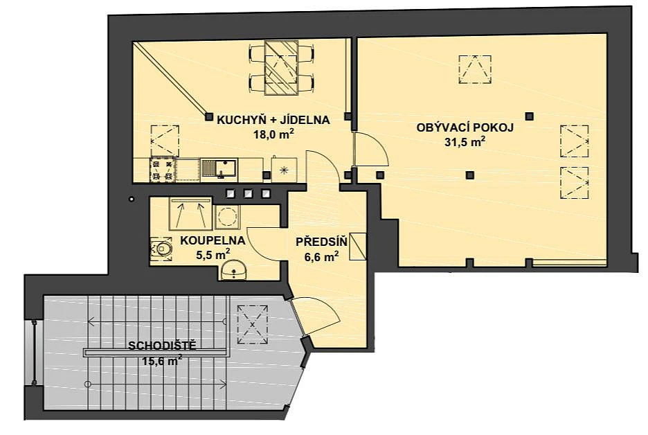 Dispozice bytu tvoří vstupní předsíň, samostatný pokoj, obývací prostor s kuchyňským koutem, koupelna se sprchovým koutem, umyvadlem a WC. K bytu náleží sklepní kóje o velikosti 4 m.