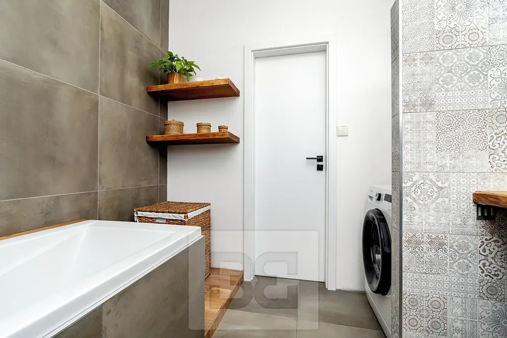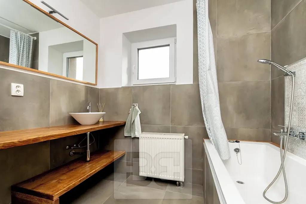 • Koupelna (5,8 m2) a WC (1,5 m2): Koupelna s vanou, umyvadlem na desce a prostorem pro pračku. Toaleta je řešena jako samostatná místnost.