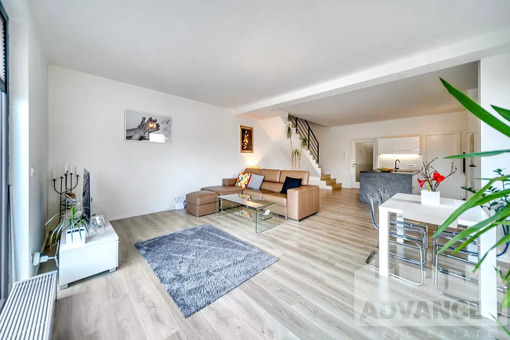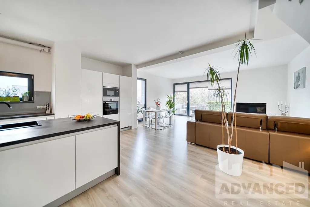 Jedinečný moderní mezonetový byt 4+kk situovaný jako polovina dvojdomu, o rozloze 119.7 m2 s terasou 9.35 m2 a soukromou zahrádkou 56.8 m2, s 2 prostornými parkovacími stáními v podzemní garáži a se sklepem 2.5 m2 v architektonicky oceněném rezidenčním projektu Origami.