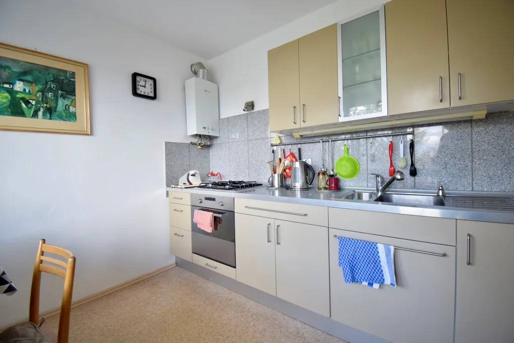 Byt se nabízí plně vybavený. Moderní kuchyně disponuje elektrickou troubou, plynovým vařičem, mikrovlnkou, lednicí a jídelním koutem. Obývací část je zařízena pohovkou, postelí, křeslem, pracovním stolem, konferenčním stolkem, televizí a skříněmi. V pěkné koupelně se nachází sprchový kout, umyvadlo, pračka a toaleta. Balkón je vybaven skříňkami a je plně zasklený.