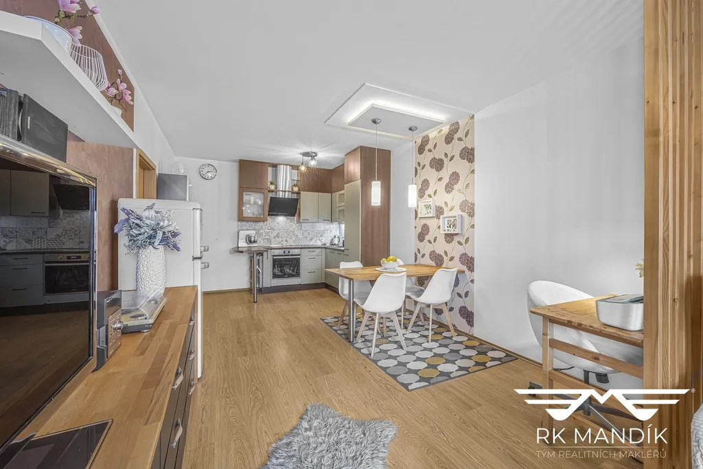 Obývací pokoj spolu s kuchyňským koutem (28,01 m²), který skýtá vestavěné spotřebiče (varná deska, digestoř, myčka nádobí, mikrovlnná trouba, elektrická trouba, kombinovaná lednice s mrazákem), nabízí dostatek prostoru, je vybaven jídelním koutem, pracovním koutem a praktickou vestavnou sklápěcí postelí. Dětský pokoj (12,67 m²) je prakticky řešen, úložný prostor zajišťuje šatní skříň, zbývá dostatek prostoru.