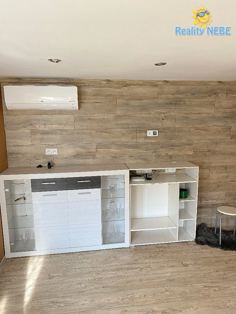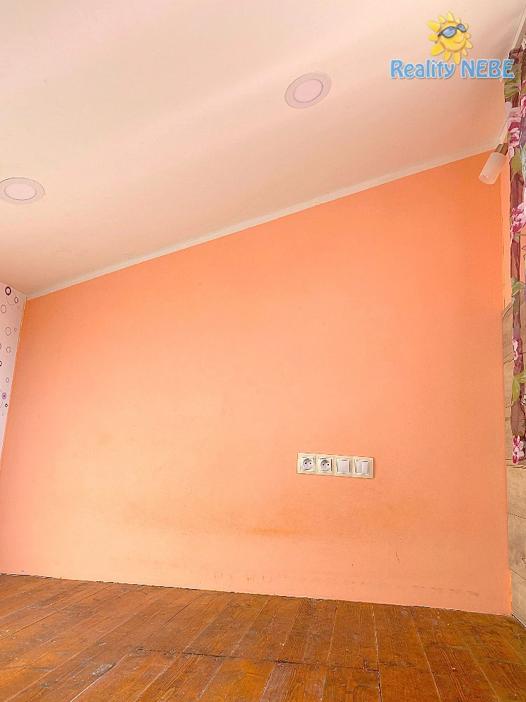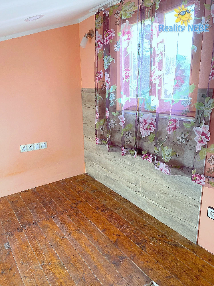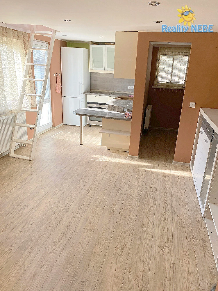 Přízemí – předsíň, obývací pokoj se zařízenou kuchyní, terasa a menší pokoj cca 4 m² (celkem cca 30 m²)