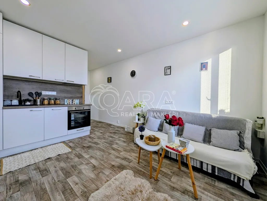 Dispozice bytu je řešena jako obytný prostor s kuchyňským koutem a koupelnou. Kuchyňská linka s vestavěnými spotřebiči (horkovzdušná trouba, el. varná deska, digestoř, myčka, a lednice s mrazákem) navazuje na obytnou část, kde je dostatek místa pro denní i noční zónu. Koupelna je vybavena sprchovým koutem a toaletou, umyvadlem a nemlžícím se zrcadlem ukazatelem teploty a dalších informací. Je zde i přípojka a prostor na pračku.