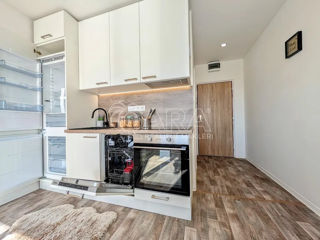 Dispozice bytu je řešena jako obytný prostor s kuchyňským koutem a koupelnou. Kuchyňská linka s vestavěnými spotřebiči (horkovzdušná trouba, el. varná deska, digestoř, myčka, a lednice s mrazákem) navazuje na obytnou část, kde je dostatek místa pro denní i noční zónu. Koupelna je vybavena sprchovým koutem a toaletou, umyvadlem a nemlžícím se zrcadlem ukazatelem teploty a dalších informací. Je zde i přípojka a prostor na pračku.