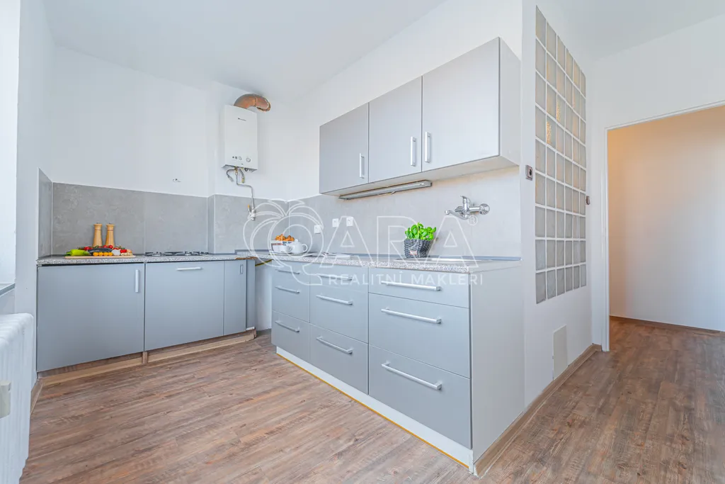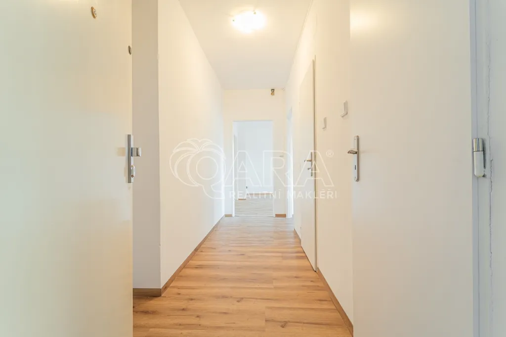 Nabízený byt má dispozici 2+1. Po vstupu do bytu se nachází chodba, z této chodby je přístupné samostatné WC a vedle něj umístěná koupelna, která je vybavena sprchovým koutem, prostorem pro pračku a jejíž prosvětlení řeší stěna z luxfer. Dále se z chodby vstupuje do kuchyně s linkou do tvaru L, kde zbývá dostatek místa i pro jídelní stůl. Přímo naproti vstupu do bytu se nachází prostorný obývací pokoj. Kuchyně je orientována stejným směrem jako obývací pokoj s výhledem na přilehlé parkoviště a zástavbu rodinných domů. Poslední místností je ložnice situovaná na opačnou, jižní stranu, která díky vzrostlým stromům nabízí výhled do klidné zeleně a zajišťuje dostatek soukromí.