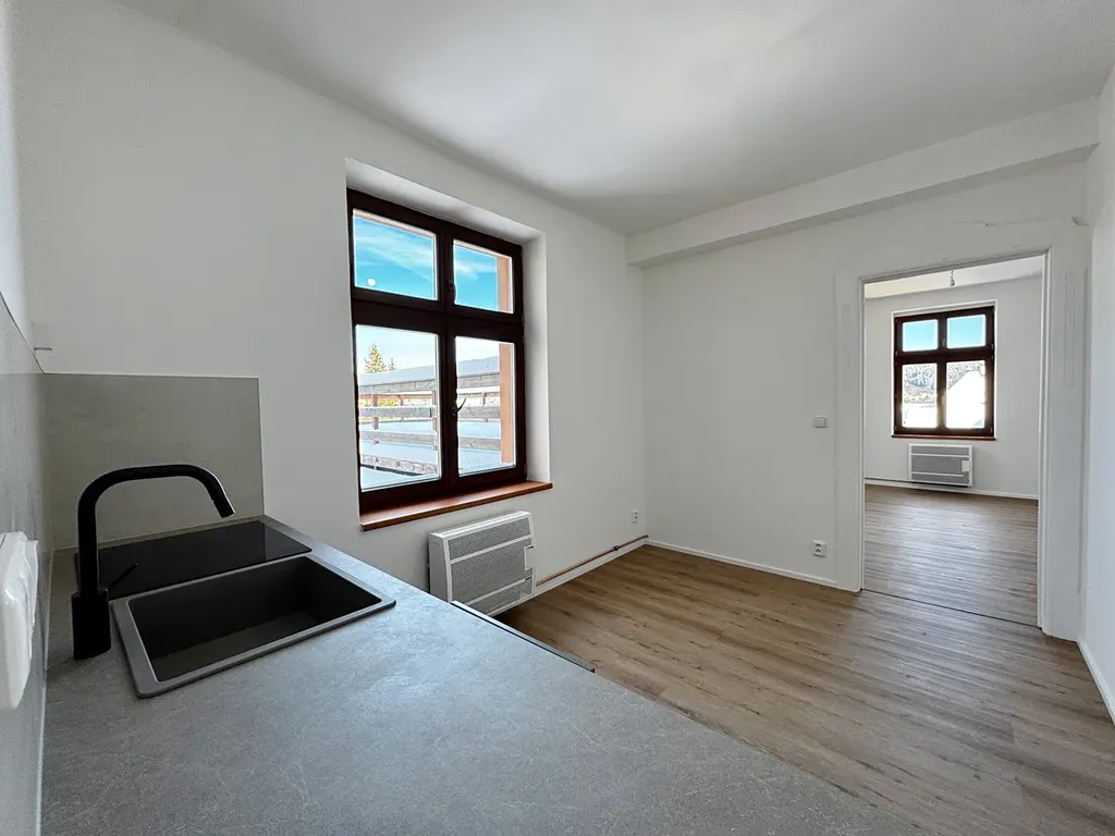 Interiér o celkové ploše 38,7 m² působí vzdušně a harmonicky díky promyšlené dispozici a dostatku denního světla. Byt tvoří hlavní obytná místnost a vstupní pokoj s nově instalovanou kuchyní v elegantním matném šedozeleném odstínu, doplněné černými akcenty. Celý prostor sjednocuje vinylová podlaha v dekoru přírodního dřeva, která interiéru dodává nadčasovost a příjemnou atmosféru.