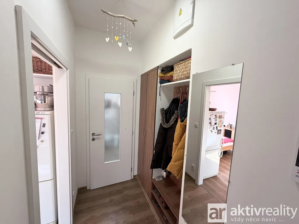 Dispozici tvoří obývací pokoj s kuchyňským koutem, ložnice, která je aktuálně částečně využívána jako pracovna, praktická šatna s vestavěnými skříněmi až do stropu a vstupní chodba s dalšími vestavěnými skříněmi, botníkem a zrcadlem. Koupelna je po kompletní rekonstrukci a nabízí vanu se sprchovou zástěnou, žebřík na sušení prádla a větrací okénko. Byt se pronajímá částečně zařízený, zůstává postel, skříně, stůl i spotřebiče. Kuchyňská linka je vybavena troubou, plynovou varnou deskou, digestoří s filtrací a myčkou. V bytě je vlastní plynový kotel se zásobníkem, vytápění je řešeno radiátory s regulací pomocí termostatu. Okna jsou plastová se žaluziemi.