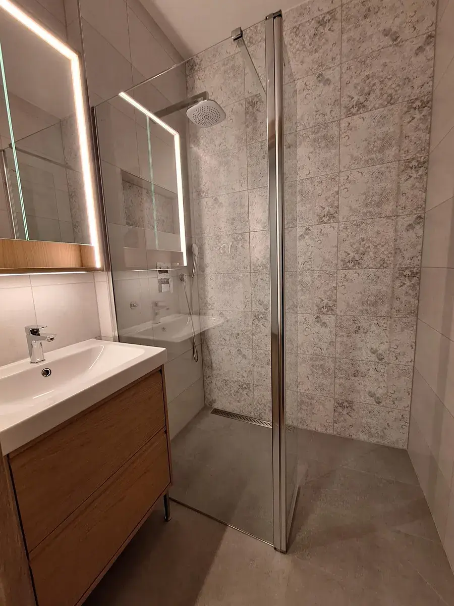 Na opačné straně bytu se nachází útulná ložnice s vestavěnou skříní a menší šatnou, která poskytuje nadstandardní úložný prostor. K ložnici náleží také druhý balkon. Samozřejmostí je elegantní koupelna se sprchovým koutem a samostatná toaleta. Po dohodě je možné využívat také zahradu.