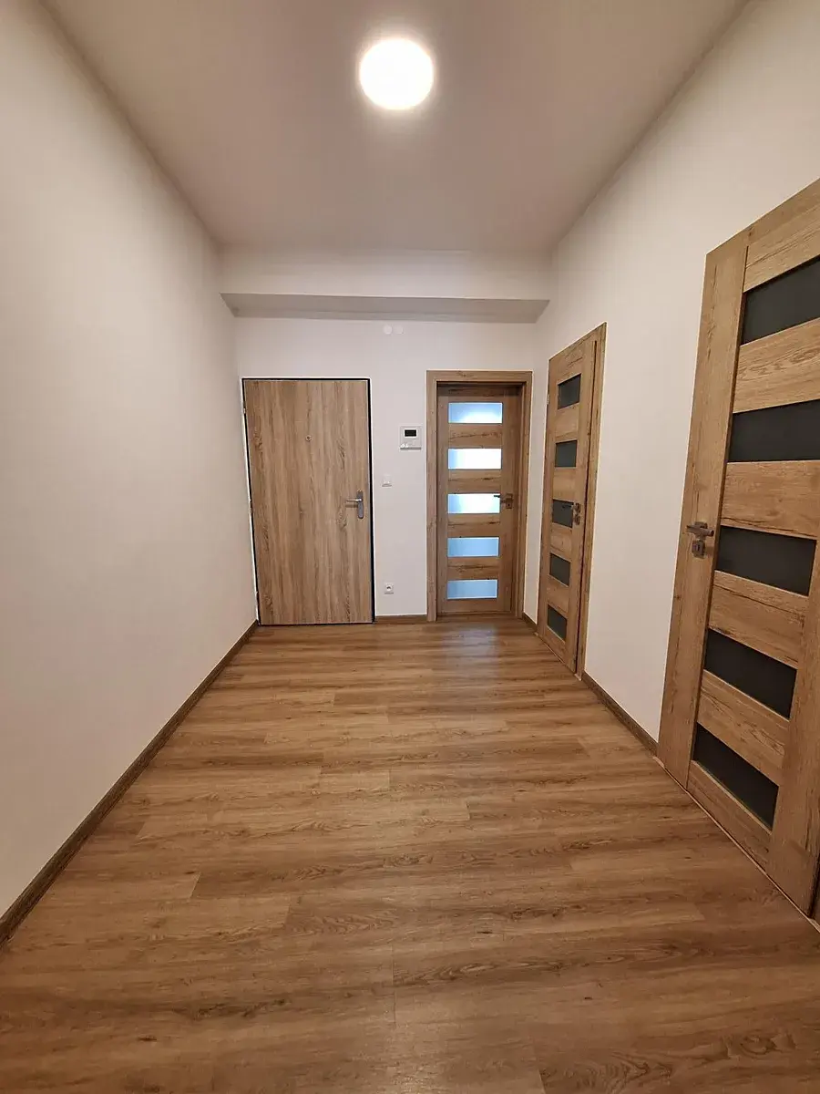 Interiér bytu je mimořádně prostorný a zcela nový. Vstupní předsíň nabízí dostatek místa pro věšákovou stěnu, botník i šatní skříň a zároveň z ní vede přístup do všech místností. Obývací pokoj je příjemně prosvětlený a orientovaný do klidné zahrady. Součástí je moderní kuchyňská linka vybavená všemi spotřebiči.