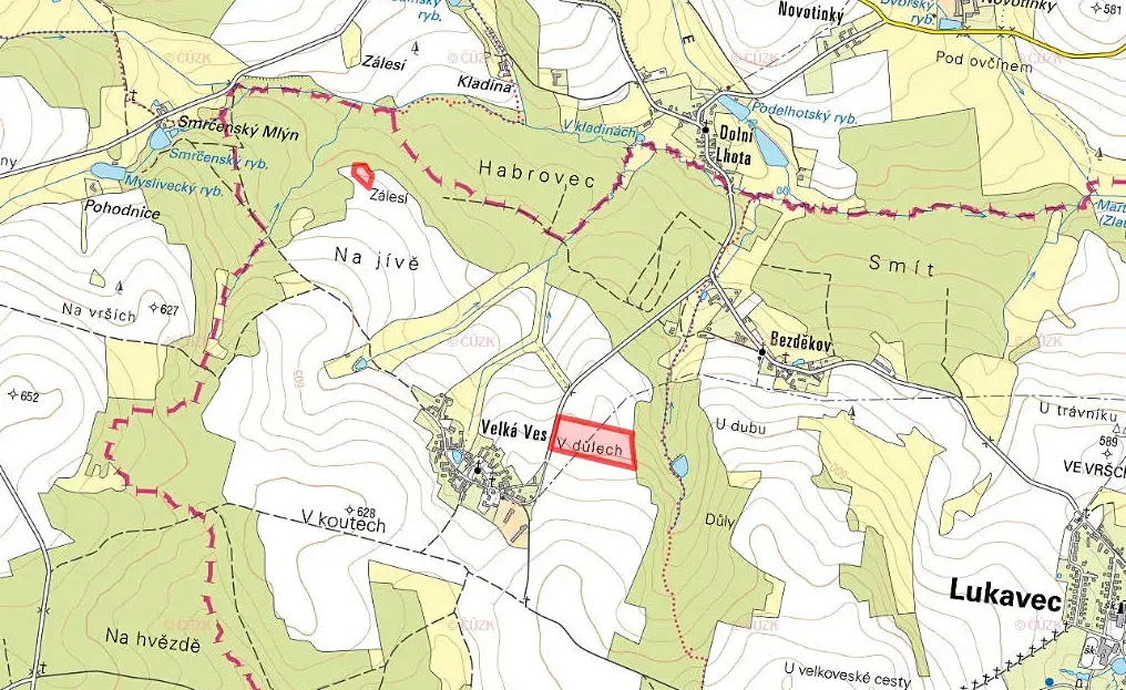 V katastrálním území Velká Ves, obec Lukavec, okres Pelhřimov, nabízíme k prodeji ornou půdu na dvou parcelách zapsaných na listu vlastnictví č. 400.