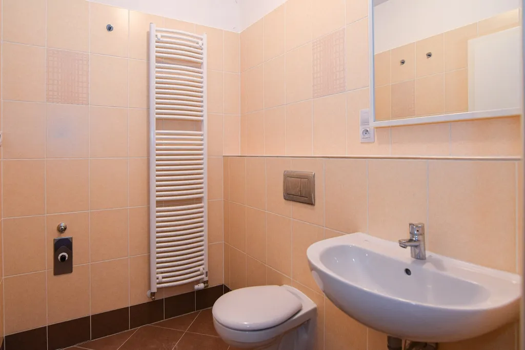 Koupelna je prostorná a je společná s toaletou. Koupelna disponuje sprchovým koutem a dostatkem prostoru na pračku a sušičku.