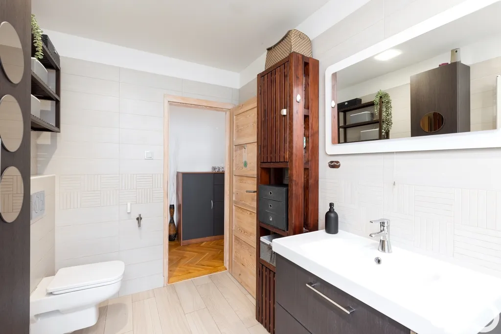 Interiér prošel rekonstrukcí v létě roku 2015. Zdařile zrekonstruovaná koupelna, kuchyň, revitalizované dřevěné parkety a plastová okna s dvojskly citlivě propojují původní charakter bytu s moderním komfortem. Vytápění zajišťuje centrální plynový kotel v domě, elektřina je částečně v mědi. Byt působí udržovaně, prostorně a je připraven k dalšímu užívání bez nutnosti zásadních investic.