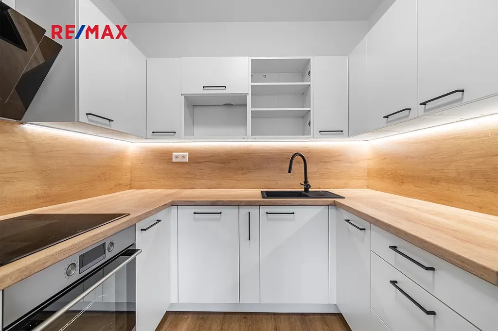 Kuchyně je vybavena vestavěnými spotřebiči: varná indukční deska, trouba, digestoř, myčka na nádobí a kombinovaná lednice s mrazákem. V bytě se nachází komora a hned vedle bytu prostorný sklep. Součástí pronájmu je také vnitřní parkovací stání.