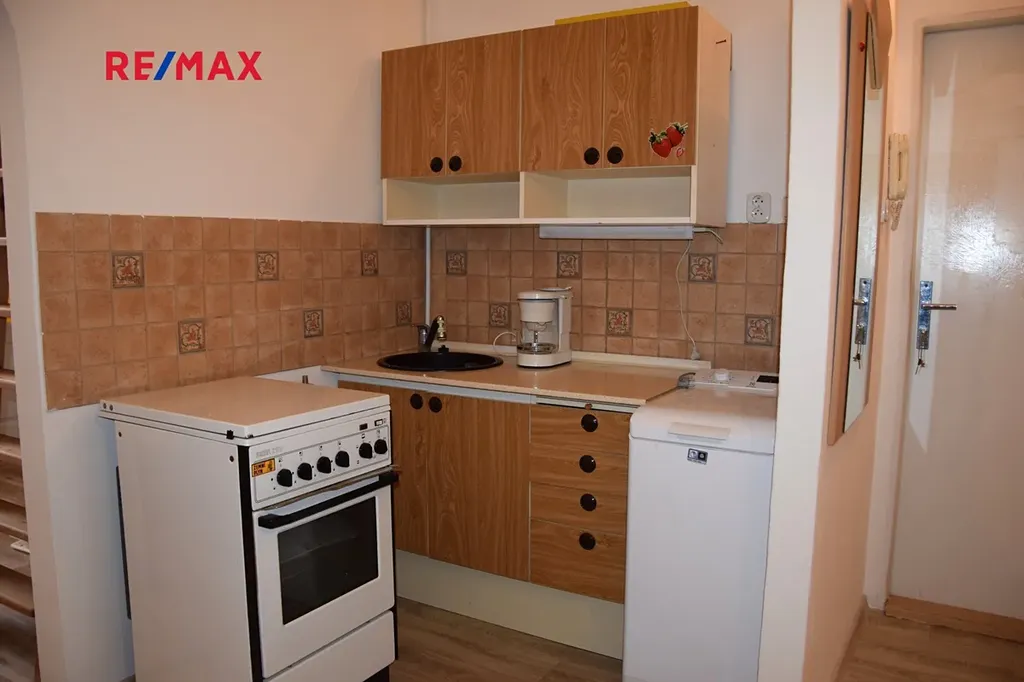 Jedná se o dvě menší místnosti s koupelnou s WC. Byt je vybaven kuchyňskou linkou, sporákem, pračkou, lednicí, patrem pro spaní, stolkem a dvěma křesly.