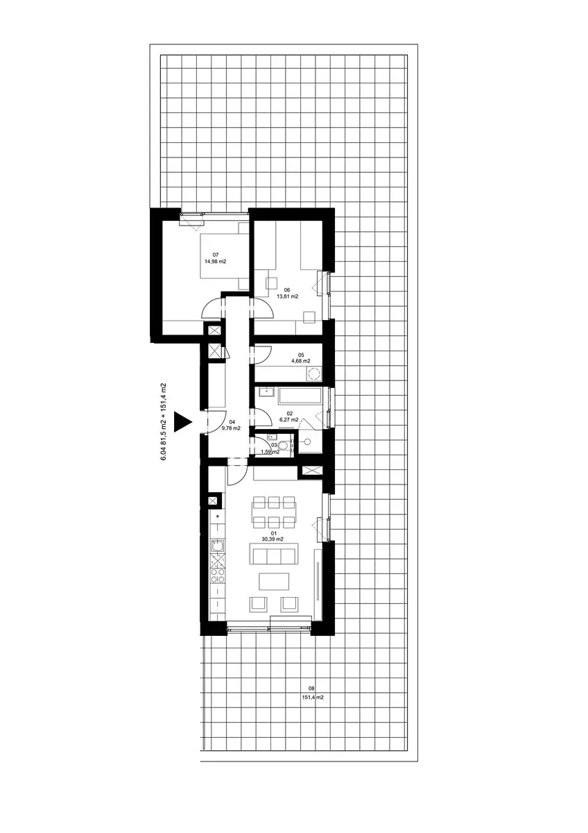 Byt zaujme velkorysou dispozicí se dvěma samostatnými ložnicemi a prostorným obývacím pokojem s kuchyňským koutem, z něhož je přímý vstup na terasu, stejně jako z každého pokoje. Nechybí prostorná předsíň, komora s přípravou pro pračku a sušičku, samostatné WC a prvotřídní koupelna, která je – stejně jako toaleta – v nadstandardním provedení.