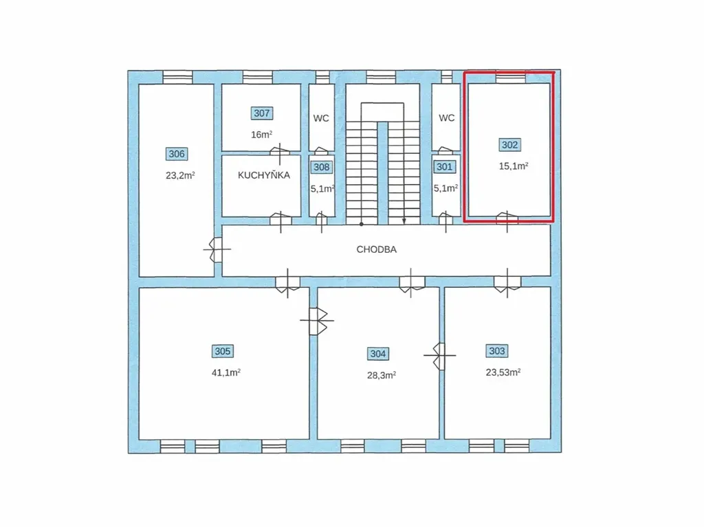 Kancelář č. 302 o ploše 15 m se nachází ve 3. nadzemním podlaží budovy s okny orientovanými do klidného dvora. Kancelář je po rekonstrukci, bíle vymalovaná, na podlaze nová PVC krytina, umývadlo s průtokovým ohřívačem teplé vody, pro internetové připojení je využitelná linka od O2.