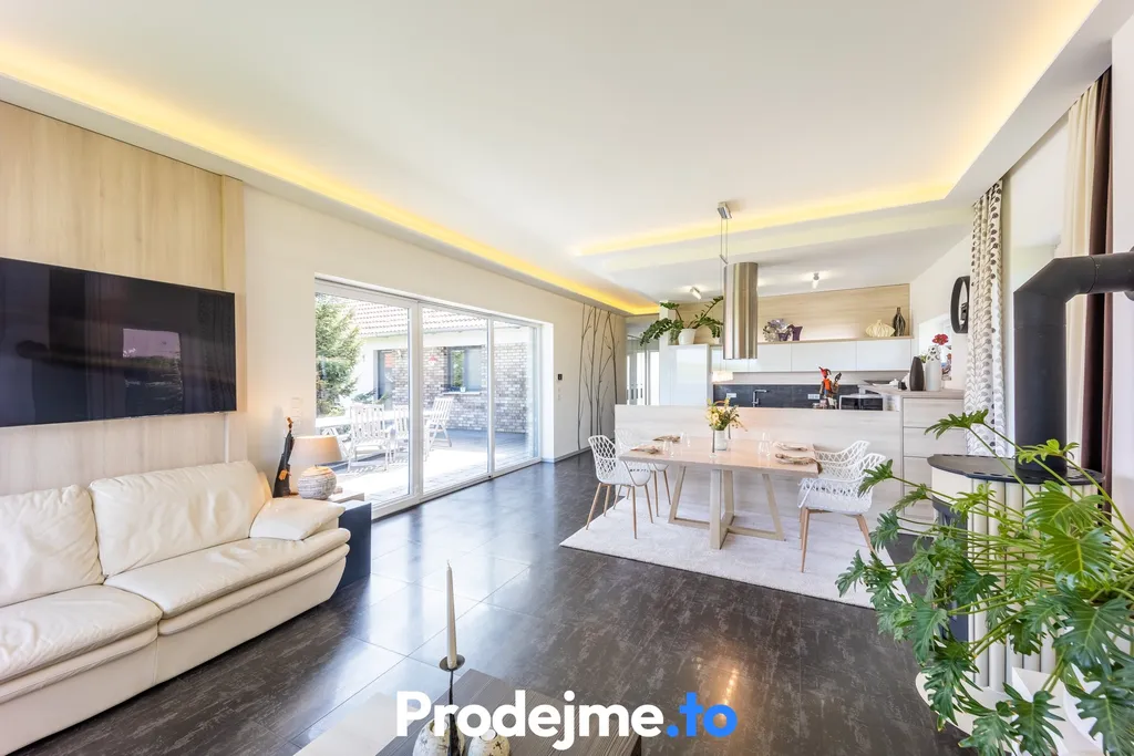 Srdcem celého domu je velkorysý obývací pokoj s kuchyňským koutem, který se rozkládá na úctyhodných 50 m². Díky nadstandardní výšce stropů, které zde dosahují 3 metrů (ve zbytku domu 2,7 m), působí celý prostor neuvěřitelně lehce a vzdušně. Přes prosklené plochy s přímým vstupem na terasu sem proudí maximum denního světla. Dokonalou atmosféru pak už jen dokreslují krbová kamna a na míru vyrobený nábytek, který v domě zůstává a vy si tak ušetříte starosti se zařizováním.
