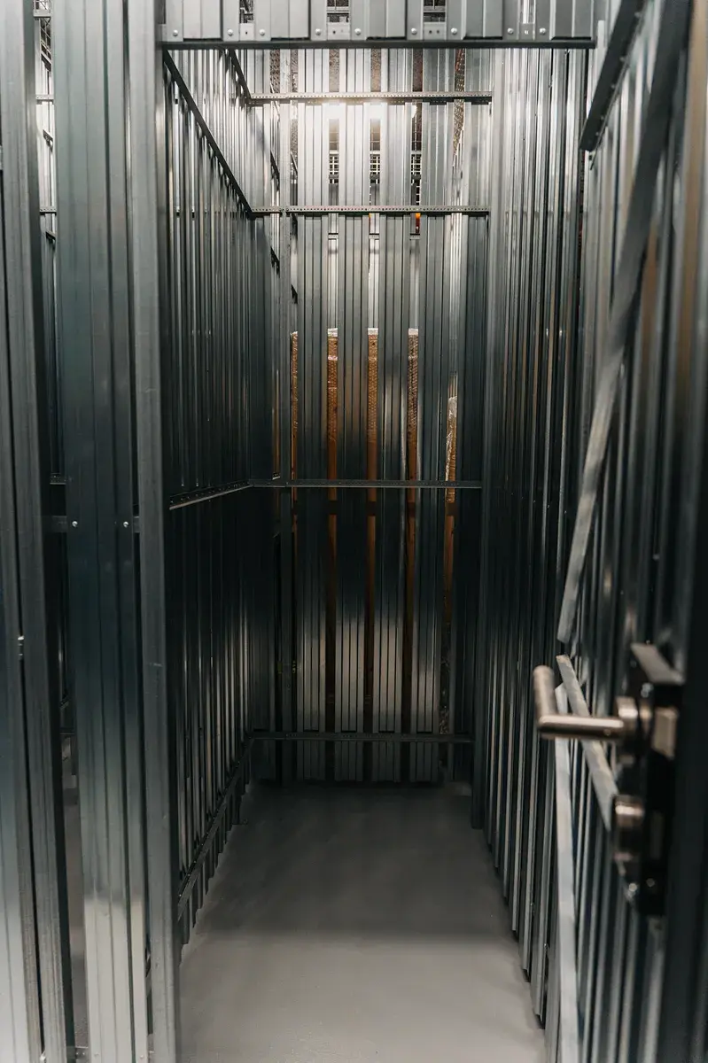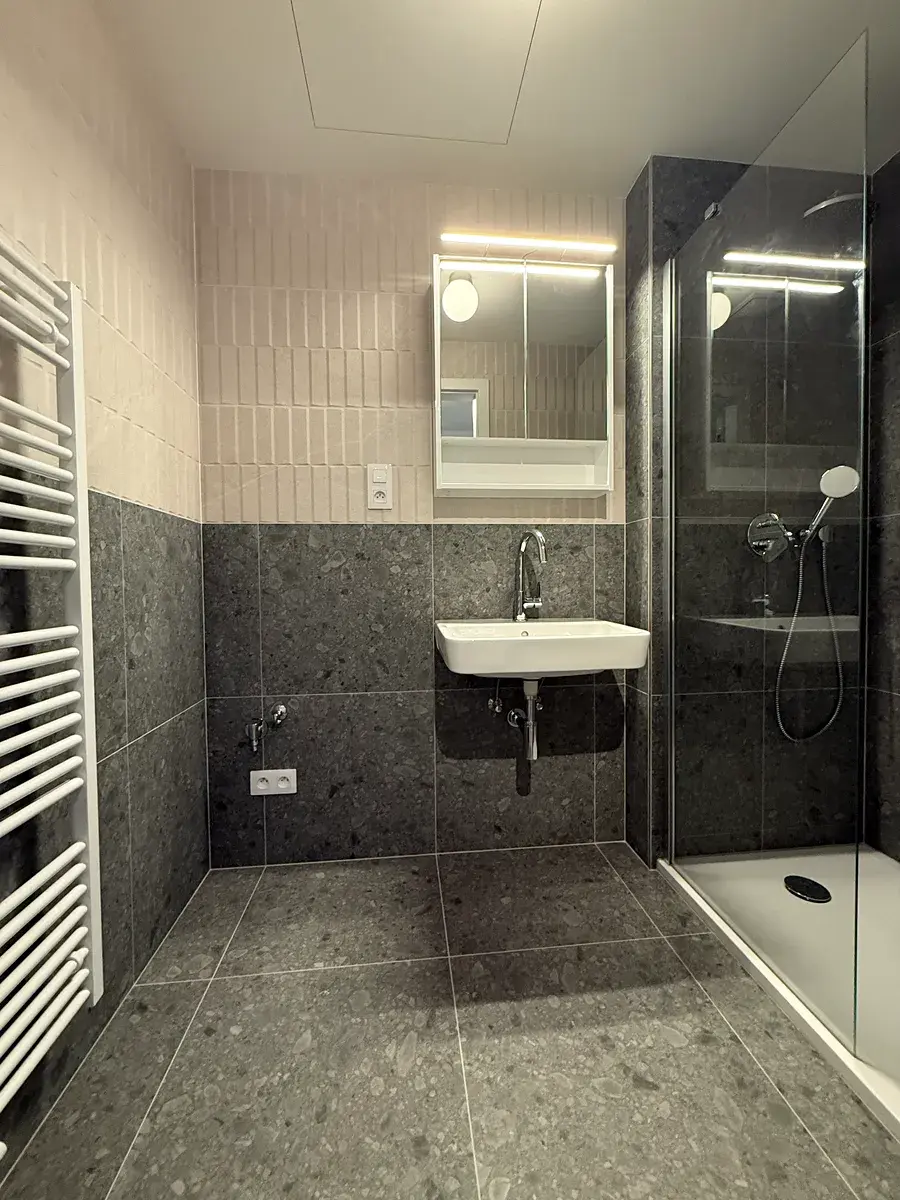 Koupelna je zpracována ve velmi vysokém standardu, s kvalitními obklady, moderní sanitou a designovou sprchovou zástěnou, což podtrhuje celkový prémiový charakter bytu. K bytu náleží také sklepní kóje a garážové parkovací stání přímo v domě.