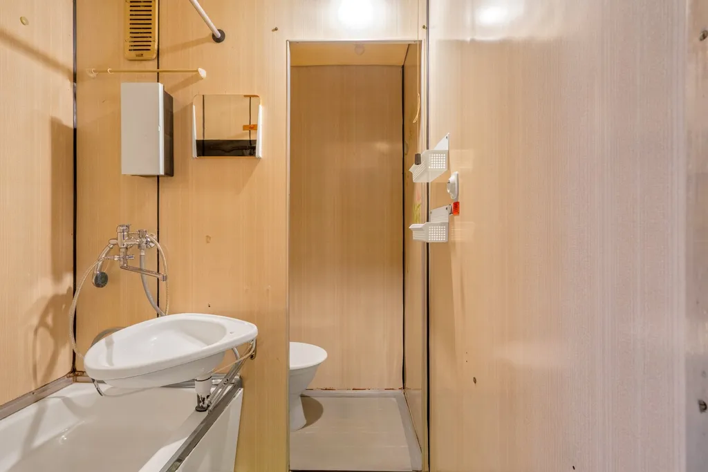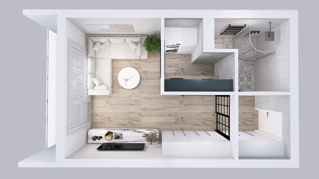 Dispoziční uspořádání je následující: vstupní chodba (4,5 m2), šatna (2,1 m2), koupelna s WC (3,0 m2), pokoj s kuchyňským koutem (18,5 m2), lodžie (3,0 m2).