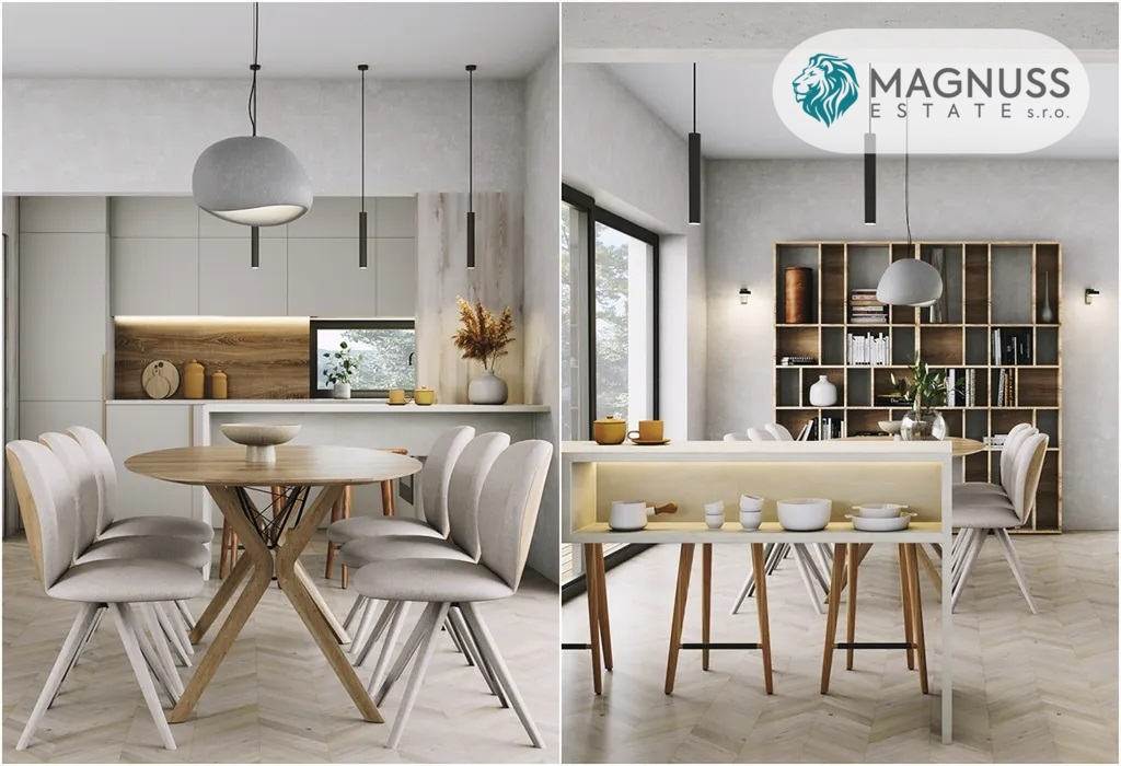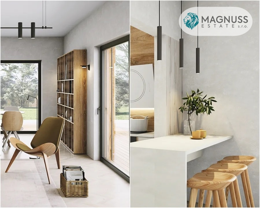 Dům je postaven moderní dřevostavbou systémem H-BLOCK, která zaručuje vysoký komfort, dlouhou životnost a výrazně nižší náklady na vytápění než klasické zděné stavby. Velkoformátová okna spolu s otevřeným obývacím prostorem, propojeným s kuchyní a otevřeným stropem, vytvářejí světlý, prostorný interiér s přímým vstupem na terasu – ideální pro odpočinek i setkávání s rodinou a přáteli.