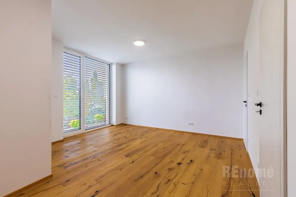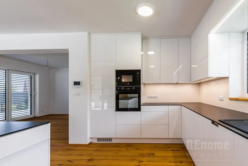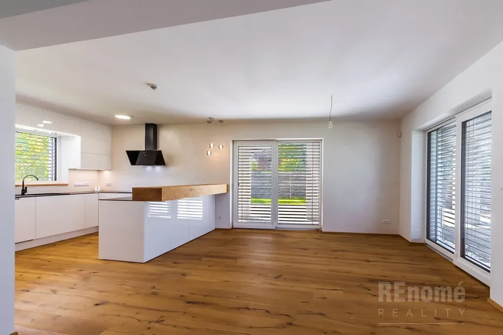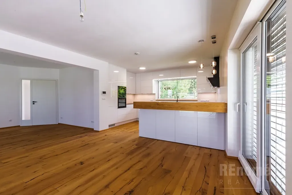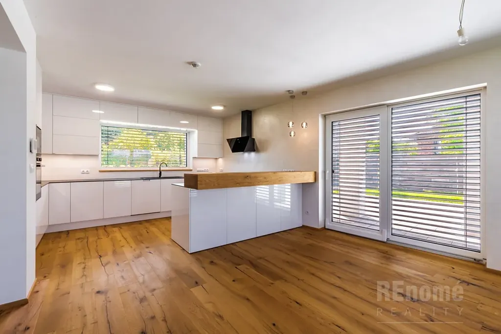 Od 01.03.2026 Vám nabízíme k pronájmu novostavbu rodinného domu (kolaudace 2023) v Jesenici, okr. Praha – západ. Moderní dům s dispozicí 5+kk (200 m2) je proveden ve vysokém standardu. Umístěn je v klidné části obce mezi rodinnými domy, přesto jen kousek od centra obce. Je obklopen okrasnou zahradou se závlahou (oproti fotografiím je již vzrostlá) o výměře 750 m2, na které se nachází bazén o velikosti 7x3x1,5m (vyhřívaný tepelným čerpadlem). Na spodní straně zahrady, za automatickou vjezdovou branou je umístěna garáž a venkovní parkovací stání. V 1.NP domu se nachází obývací pokoj s kuchyňským koutem (56 m2), ložnice (14 m2), koupelna s WC (6 m2), chodba s úložnými prostrory (11 m2), technická místnost (3,5 m2) a schodiště do 2.NP. Hlavní předností domu je jeho otevřenost do zahrady, z každé obytné místnosti i kuchyně je přístup na venkovní krytou terasu. V 2. NP naleznete ložnici (20 m2) se šatnou (6 m2) a koupelnou s WC (6m2), další 2 neprůchozí ložnice (23 a 15m2). Samostatná koupelna s oknem (18 m2) a sprchou je vybavena prostornou saunou zbudovanou na míru! Chodba nabízí velké množství úložných prostor - vestavěné skříně vyrobené na míru po celé své délce. Šatna u největší z ložnic je vybavena policovým systémem. Na patře je rovněž samostatné WC. Moderní prostorná kuchyně je vybavena všemi potřebnými spotřebiči (vestavná trouba, MW trouba, myčka, indukční varná deska, digestoř, lednice s mrazničkou). Velkoformátová okna jsou opatřena venkovními žaluziemi. Vytápění a ohřev teplé vody zajišťuje plynový kotel. Zabezpečovací system je samozřejmostí.