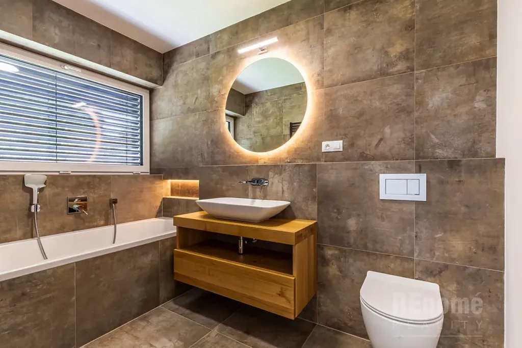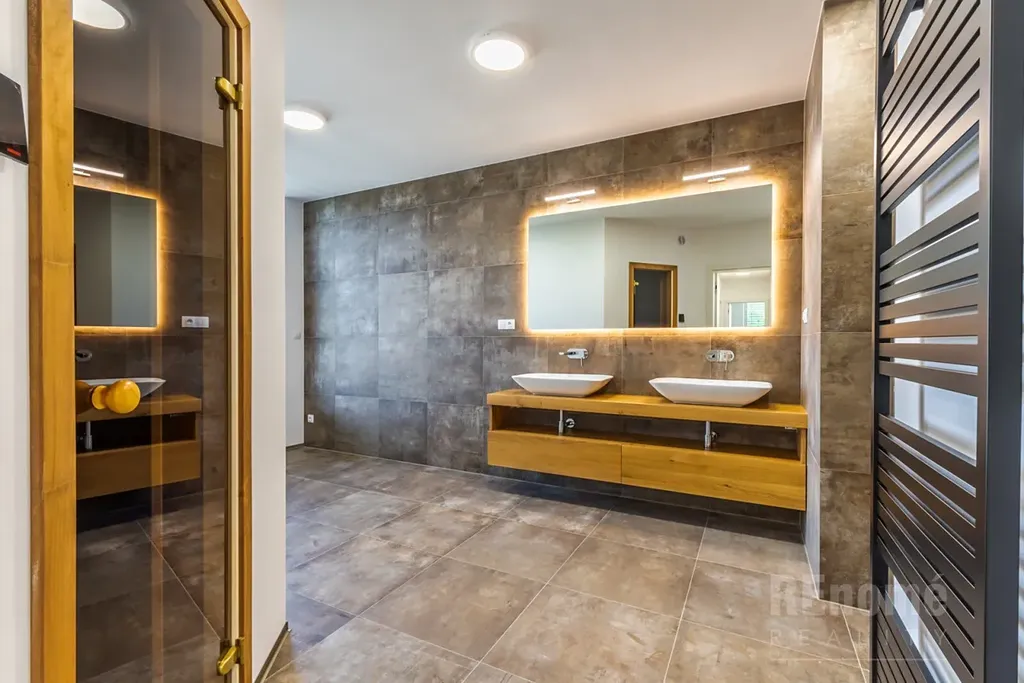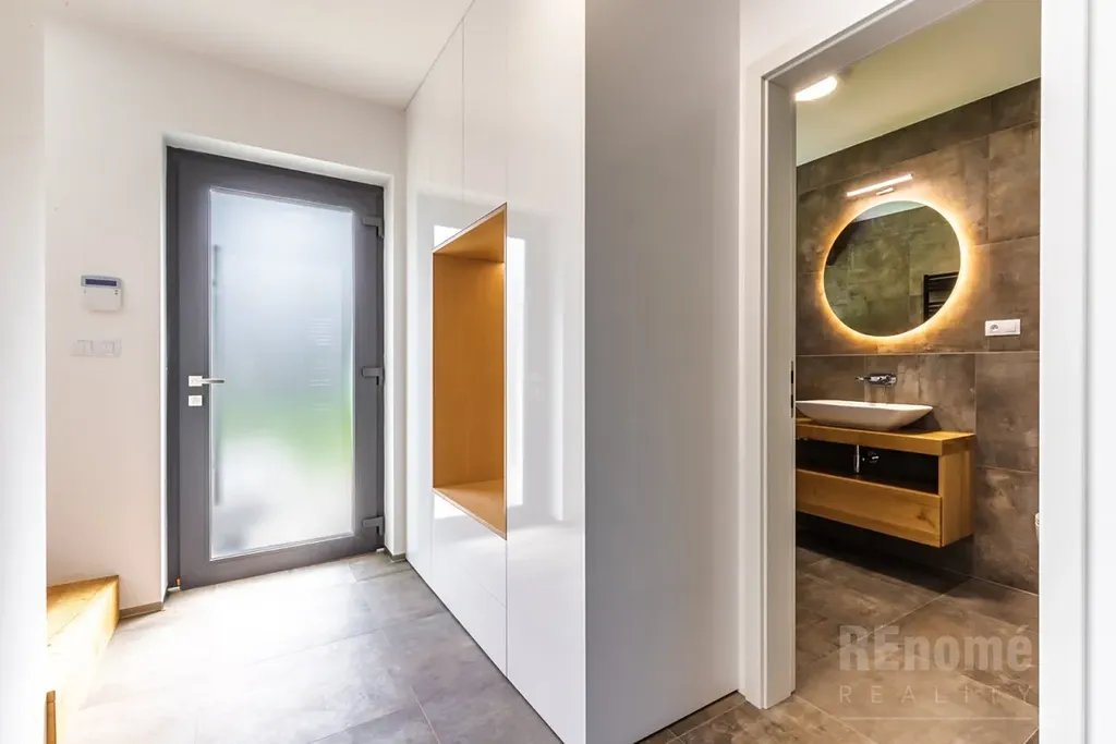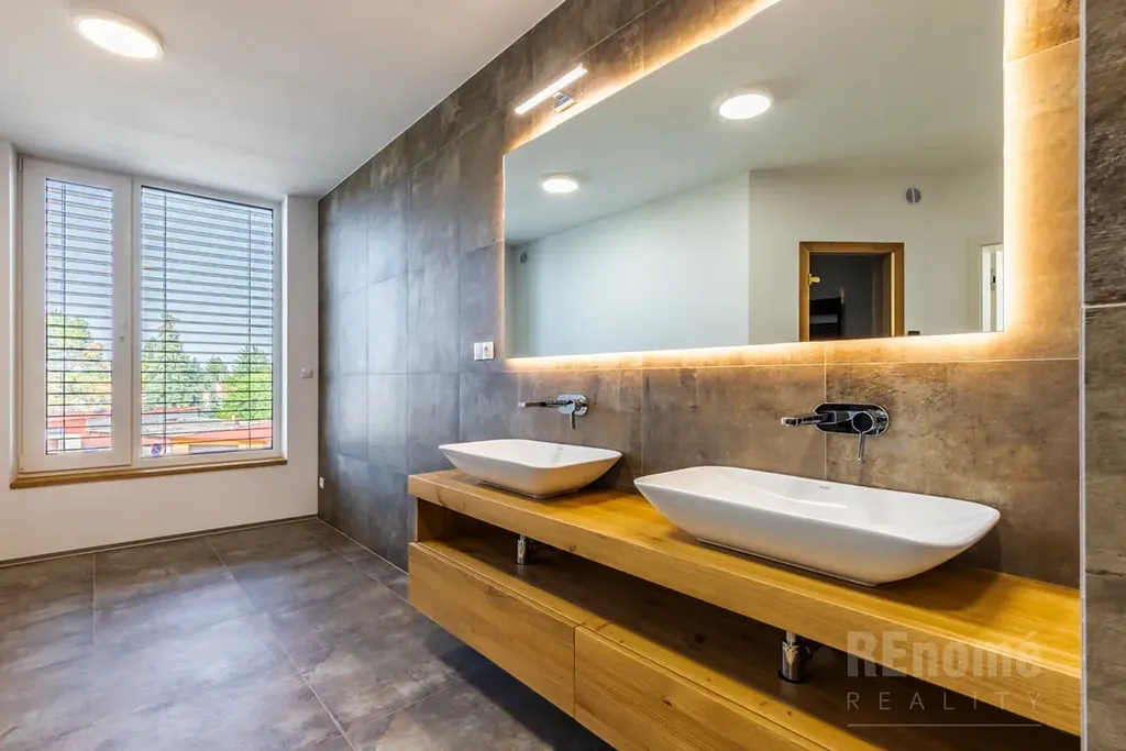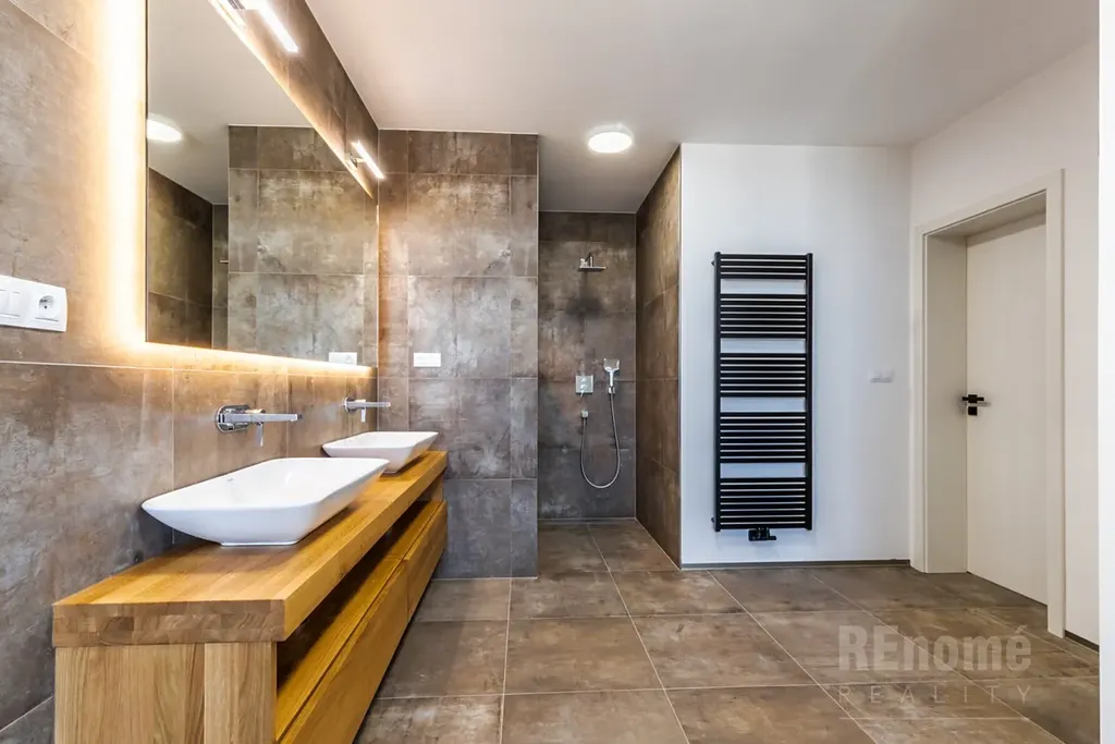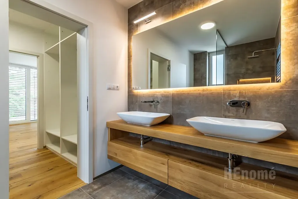Od 01.03.2026 Vám nabízíme k pronájmu novostavbu rodinného domu (kolaudace 2023) v Jesenici, okr. Praha – západ. Moderní dům s dispozicí 5+kk (200 m2) je proveden ve vysokém standardu. Umístěn je v klidné části obce mezi rodinnými domy, přesto jen kousek od centra obce. Je obklopen okrasnou zahradou se závlahou (oproti fotografiím je již vzrostlá) o výměře 750 m2, na které se nachází bazén o velikosti 7x3x1,5m (vyhřívaný tepelným čerpadlem). Na spodní straně zahrady, za automatickou vjezdovou branou je umístěna garáž a venkovní parkovací stání. V 1.NP domu se nachází obývací pokoj s kuchyňským koutem (56 m2), ložnice (14 m2), koupelna s WC (6 m2), chodba s úložnými prostrory (11 m2), technická místnost (3,5 m2) a schodiště do 2.NP. Hlavní předností domu je jeho otevřenost do zahrady, z každé obytné místnosti i kuchyně je přístup na venkovní krytou terasu. V 2. NP naleznete ložnici (20 m2) se šatnou (6 m2) a koupelnou s WC (6m2), další 2 neprůchozí ložnice (23 a 15m2). Samostatná koupelna s oknem (18 m2) a sprchou je vybavena prostornou saunou zbudovanou na míru! Chodba nabízí velké množství úložných prostor - vestavěné skříně vyrobené na míru po celé své délce. Šatna u největší z ložnic je vybavena policovým systémem. Na patře je rovněž samostatné WC. Moderní prostorná kuchyně je vybavena všemi potřebnými spotřebiči (vestavná trouba, MW trouba, myčka, indukční varná deska, digestoř, lednice s mrazničkou). Velkoformátová okna jsou opatřena venkovními žaluziemi. Vytápění a ohřev teplé vody zajišťuje plynový kotel. Zabezpečovací system je samozřejmostí.