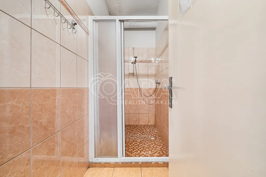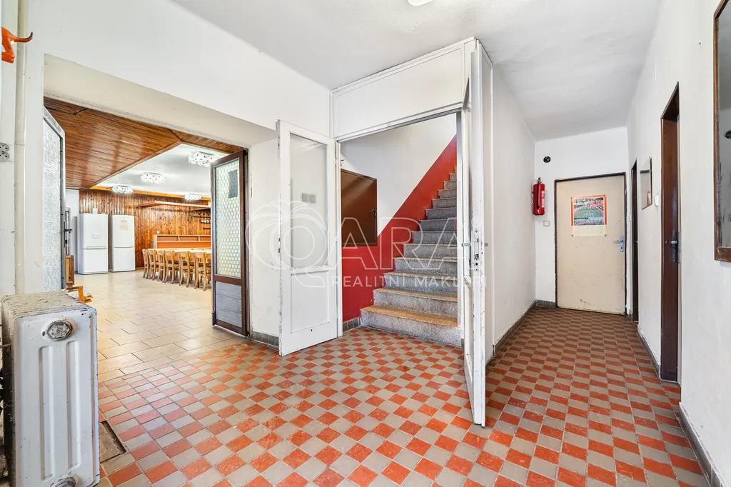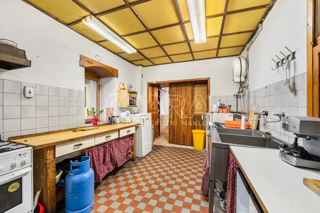 V přízemí se nachází vstupní chodba, dva sklady, kuchyň, prostorný společenský sál s barem a krbovými kamny, dámské a pánské toalety, sprchový kout a technické zázemí.
