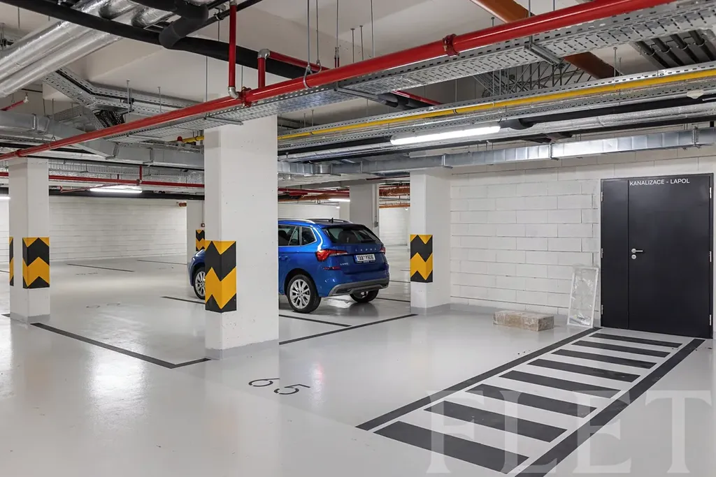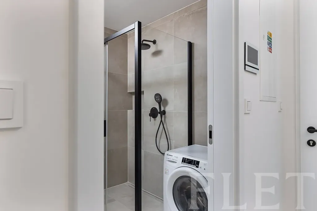 V koupelně se nachází sprchový kout, toaleta a kombinovaná pračka se sušičkou a je zde podlahové vytápění. K bytu náleží také sklep a garážové stání, které výrazně zvyšují pohodlí každodenního bydlení.