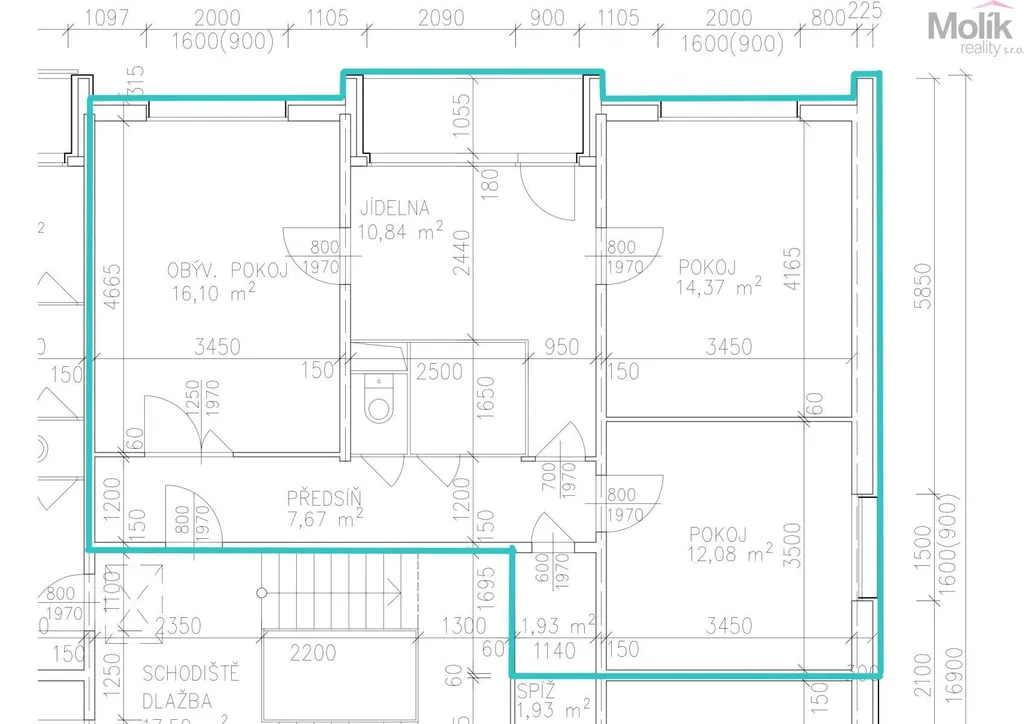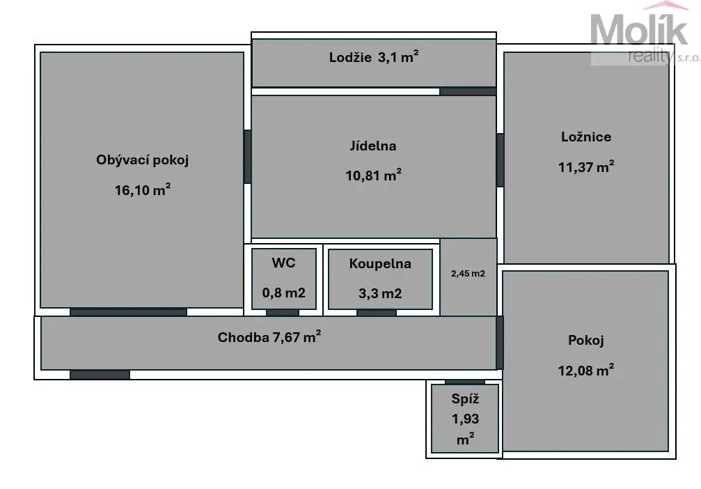 Chodba, kuchyně, obývací pokoj, pokoj, ložnice, koupelna, samostatné WC, spíž.