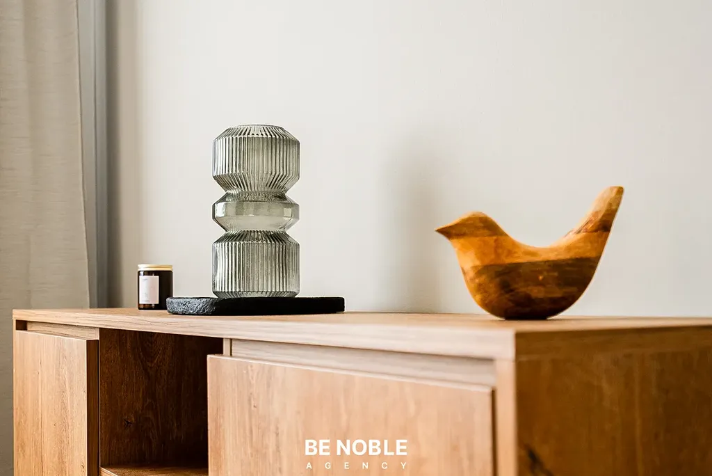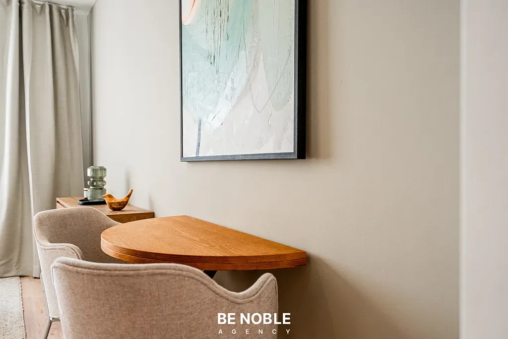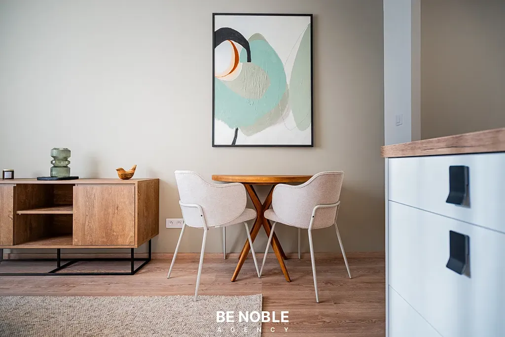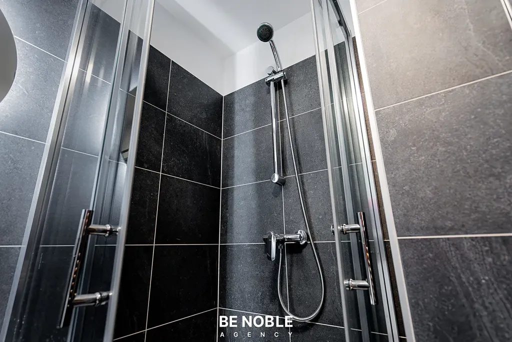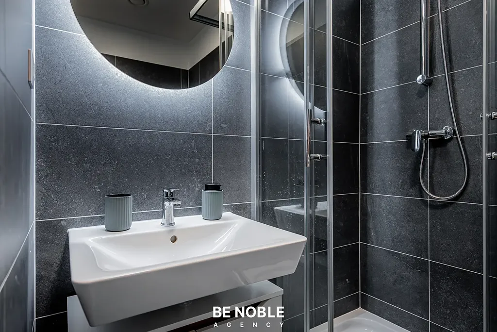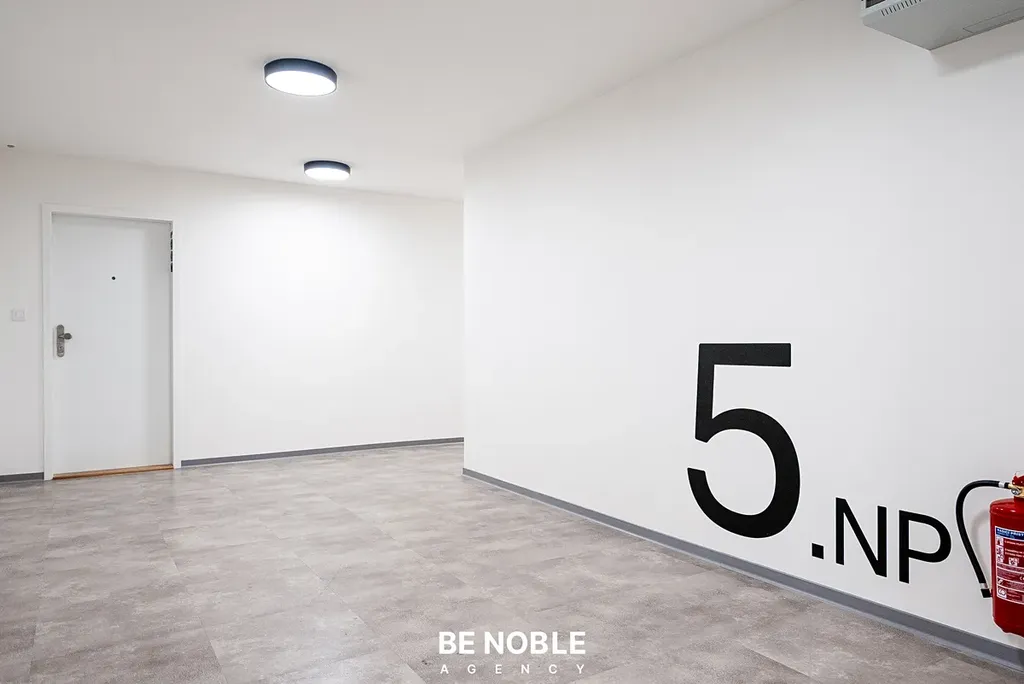 Byt byl navržen tak, aby dokonale využil každý centimetr prostoru a zároveň působil útulně i elegantně. Součástí je moderní kuchyňská linka s dostatkem úložných prostor, varnou deskou, lednicí, mikrovlnnou troubou a vestavěnou digestoří. Obytná část je vybavena kompletním nábytkem, dekorem a osvětlením od společnosti Bonami v celkové hodnotě přes 350 000 Kč – tedy nejen kuchyní, ale i pohovkou, komodou, stolem, závěsy, záclonami a designovými svítidly. Výsledkem je byt, který je připraven k okamžitému užívání nebo pronájmu – bez nutnosti dalších investic. Velké okno orientované do klidného vnitrobloku zajišťuje dostatek světla a příjemný výhled z 5. patra. V koupelně se nachází sprchový kout, toaleta a úložné prostory pod umyvadlem.