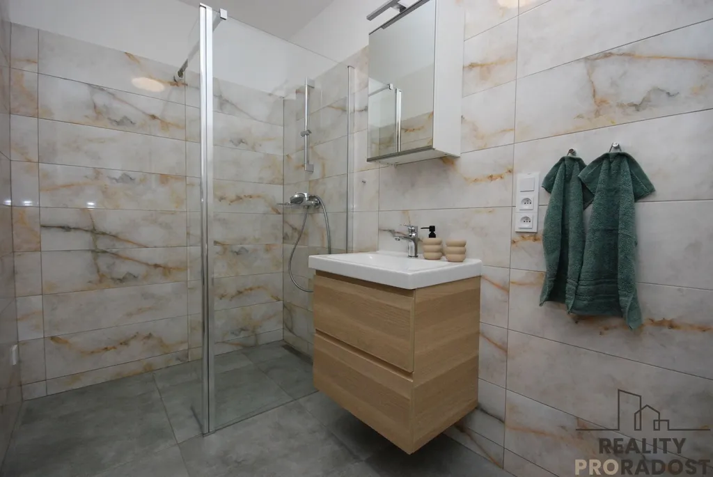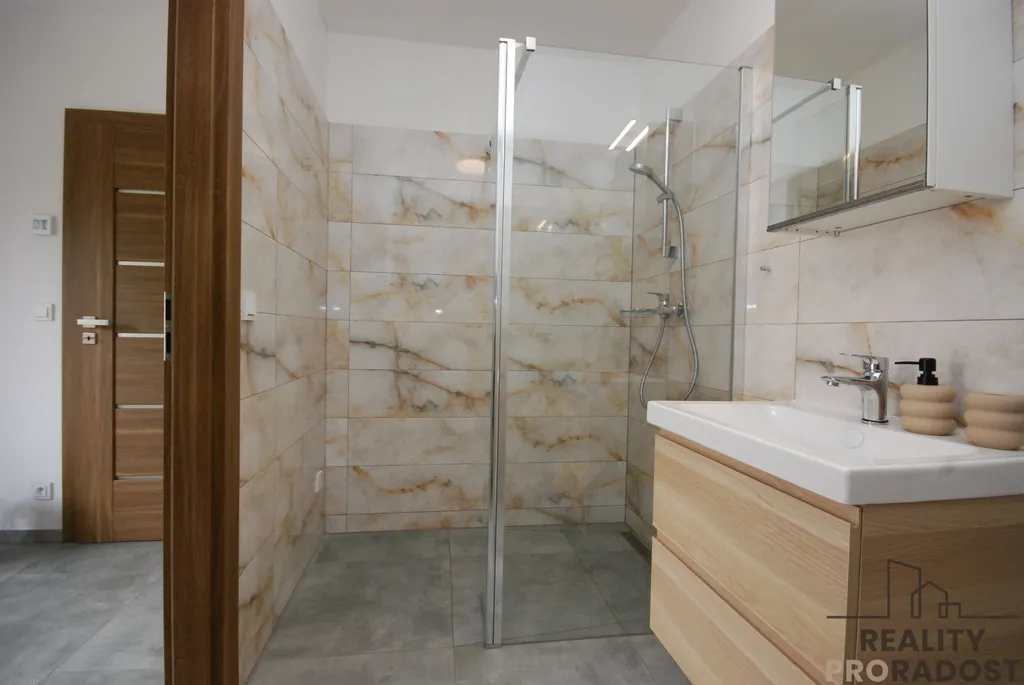 Koupelna je prostorná, s umyvadlem, WC, sprchovým koutem a místem na pračku i sušičku.