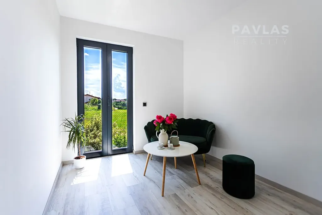 Dispozice domu zahrnuje prostorný obývací pokoj s kuchyní o velikosti 40 m², ze kterého je přístup na velkou terasu o výměře 25 m². Francouzská okna poskytují nádherný výhled na České Budějovice a přinášejí do interiéru spoustu přirozeného světla. Kuchyně s ostrůvkem je vybavena moderními spotřebiči Bosch, zaručujícími vysoký standard a komfort.