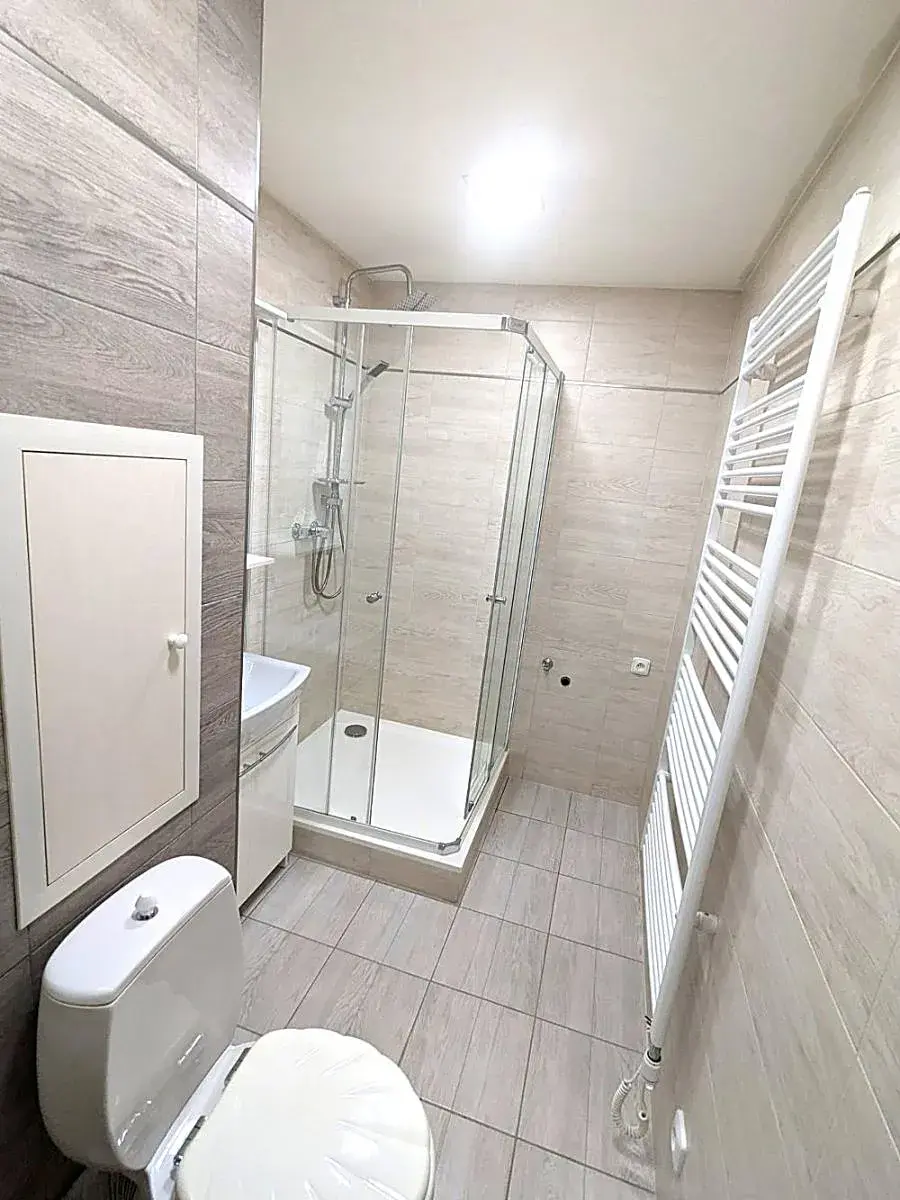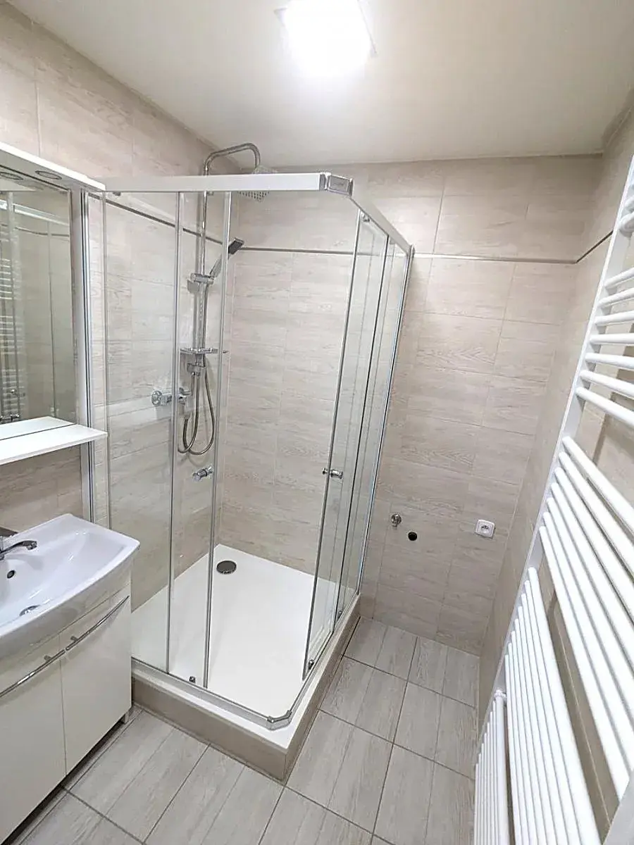 Koupelna: Komfortní sprchový kout, WC a prostor pro pračku.