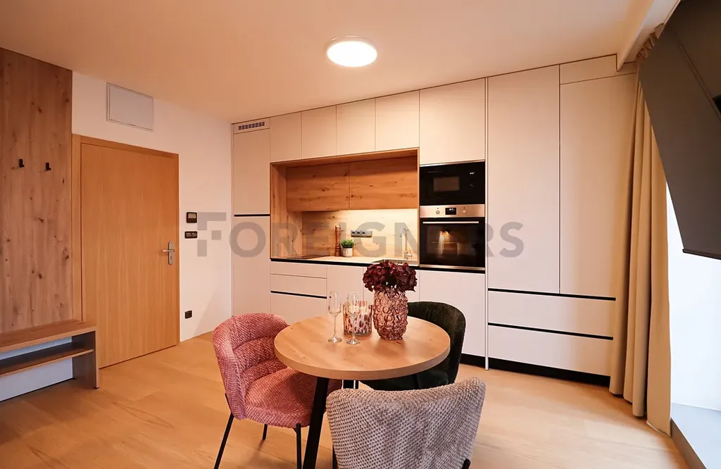 Byt se skládá z malé vstupní chodby, obytného pokoje s kuchyňským koutem, koupelny se sprchovým koutem a umyvadlem, toaletou a multifunkční pračkou se sušičkou. Tento moderní byt je ideální pro 1 až 2 osoby.