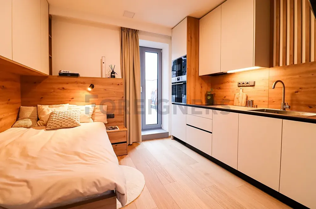 Byt se skládá z malé vstupní chodby, obytného pokoje s kuchyňským koutem, koupelny se sprchovým koutem a umyvadlem, toaletou a multifunkční pračkou se sušičkou. Tento moderní byt je ideální pro 1 osobu.